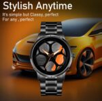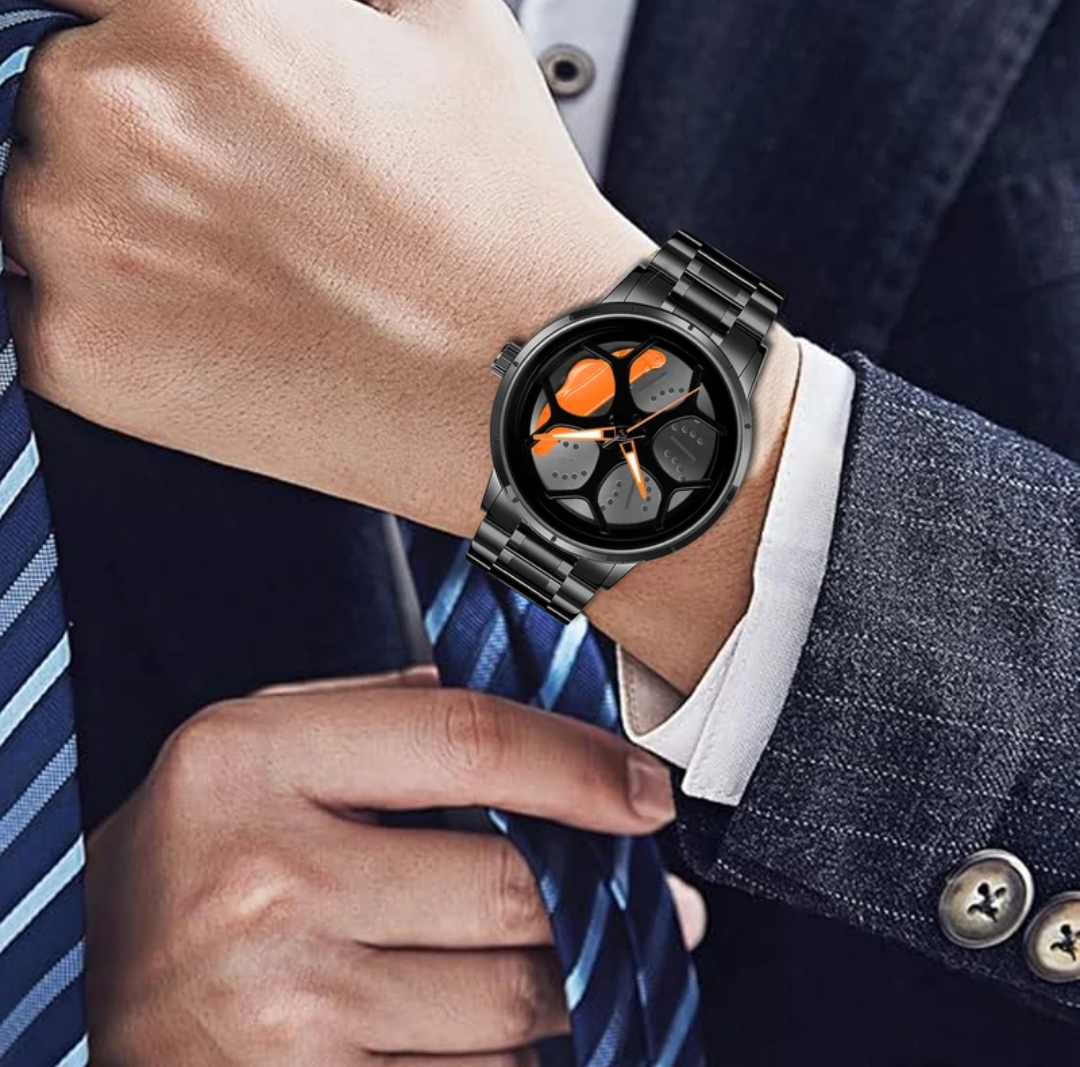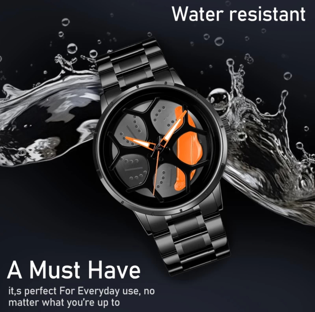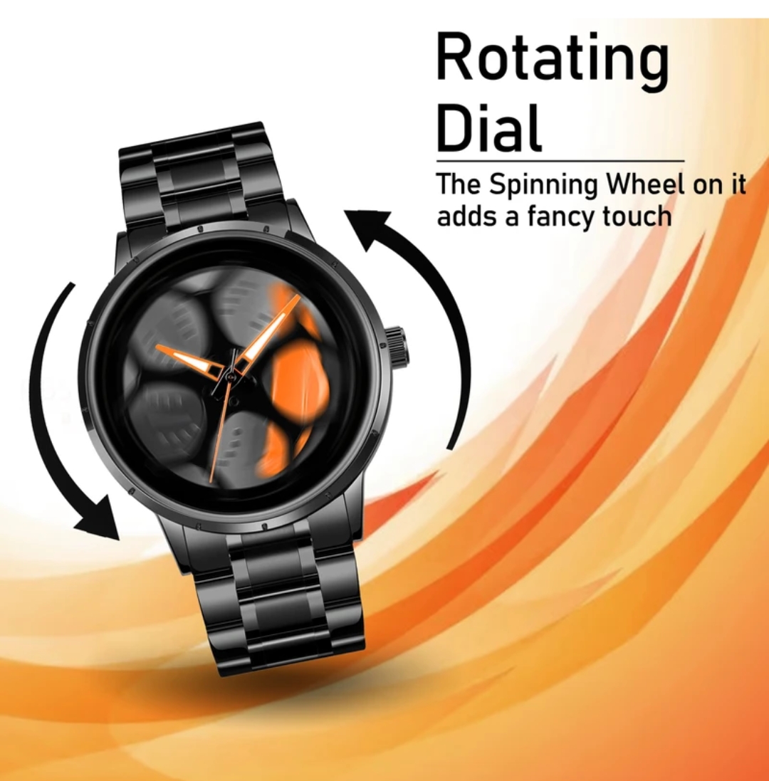 This Car Wheel Watch features a bold car rim hub design, crafted from high-quality stainless steel with Quartz Movement for style and reliability. Its scratch-resistant, water-resistant build ensures durability for active lifestyles. The unique spinning wheel and rugged design make it perfect for daily wear and adventurous activities, adding a dynamic touch to any wardrobe. Ideal for car enthusiasts, it combines style with functionality, ready to withstand any adventure